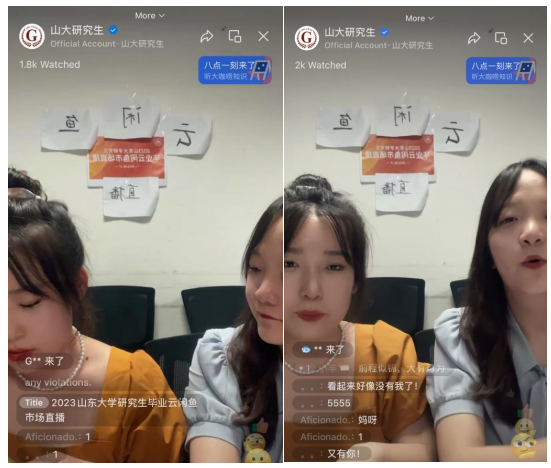 “毕业云闲鱼市场”以直播形式,为广大毕业研究生提供线上出售闲置物品的机会,由2名主持专业把控,依托视频号资源的多轮次互动为顺利“直播带货”提供了便捷渠道,近2000人次线上收看并互动,累计点赞量1万人次。
