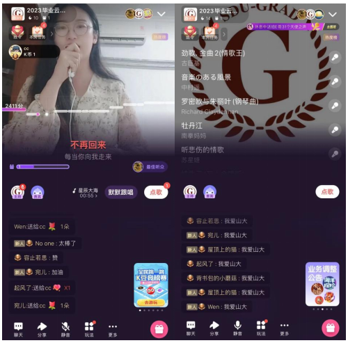 “毕业云歌会”通过“全民K歌”APP邀请毕业研究生歌手在“云端”开唱,同时开放连麦渠道,所有参与人员及毕业生均可加入献唱,当日参与人次近500,同时多场互动抽奖,使活动更加火热。