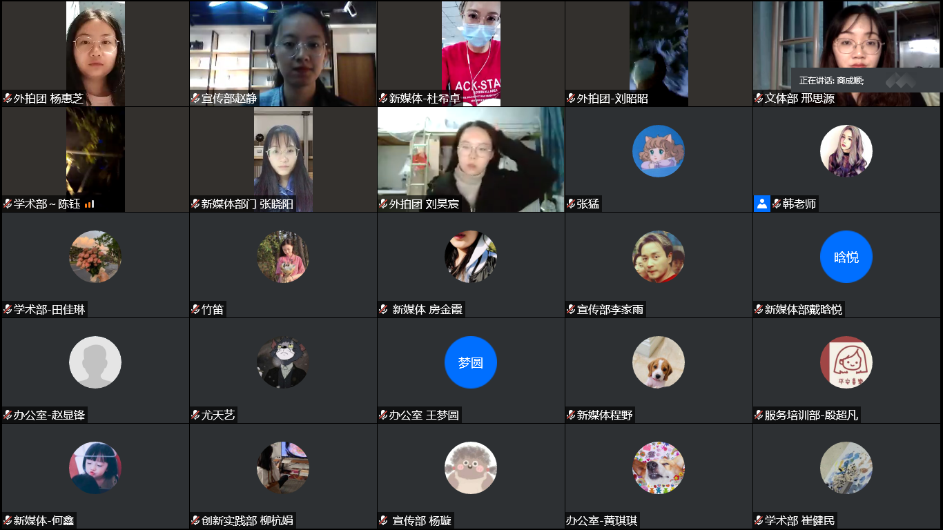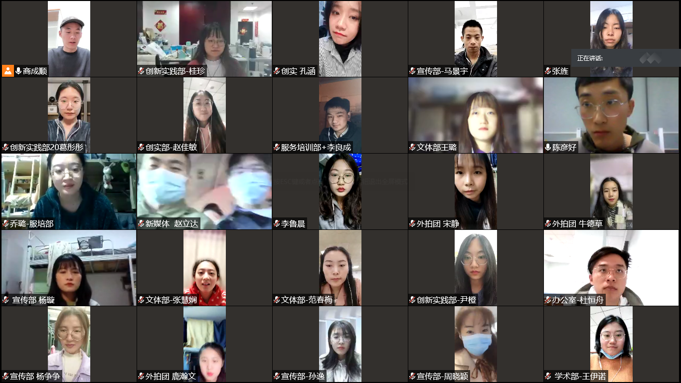 团工委兼职副书记、各部门部长、副部长分别介绍了部门工作安排、工作考察方式等。兼职副书记李星颖对其分管的三个部门的工作给予肯定,并对各部门提出更高要求,她表示学术部需要针对不同的学术活动有所侧重;办公室要利用微信的新功能创新工作方式,如推行线上会议和线上文档的模式;服务培训部应针对不同人群开展相应的培训活动。兼职副书记刘萍介绍了新媒体部和宣传部的工作计划,她指出山大研究生微信公众号的日常运营是新媒体部的工作重点,要充分利用部门成员的优势,开展视频剪辑、动画设计等技术培训工作,在发挥传统优势的基础上进行创新;宣传部需要完善自己的工作职能,架起团工委同各学院之间的沟通桥梁,并同新媒体部互相补充互相协调,共同做好宣传工作。兼职副书记商成顺表示文体部在举办研究生篮球赛时需要注意好同学们的安全和疫情防护问题;扩大外拍团内部活动的影响力,统筹线下摄影展、摄影培训等活动的开展时间;创新实践部需要努力开展切合本部门宗旨的特色活动。随后各部门新成员视频连线自我介绍,最后大家在线上留下了团工委2020-2020届成员的“云”合影。