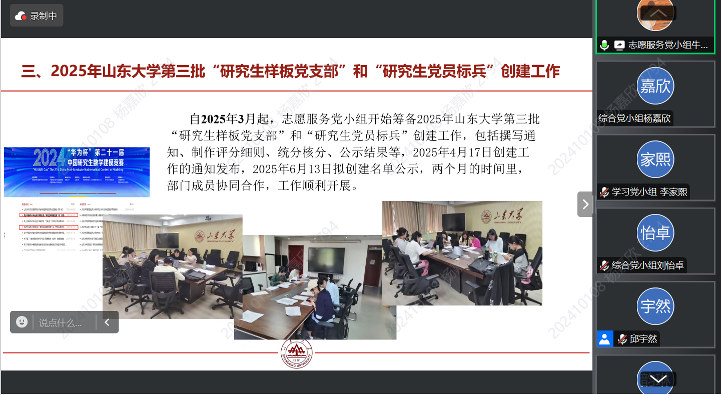 过去一学年,在研究生院、党委研究生工作部的坚强领导和有力支持下,2024级研究生骨干临时党支部紧密围绕“一报一赛一培训一评选”核心任务,扎实开展了“知行者”·2024年度研究生党支部书记培训、21天读书打卡、首届研究生党支部主题党日案例大赛、校园安全宣讲竞展赛暨第九届校园安全短视频大赛、党建“双十”评选建设等。这一系列工作的有序推进和落实,有效增强了支部的战斗堡垒作用和党员先锋模范作用,为营造风清气正、积极进取的校园育人环境提供了坚实的政治和组织保障。