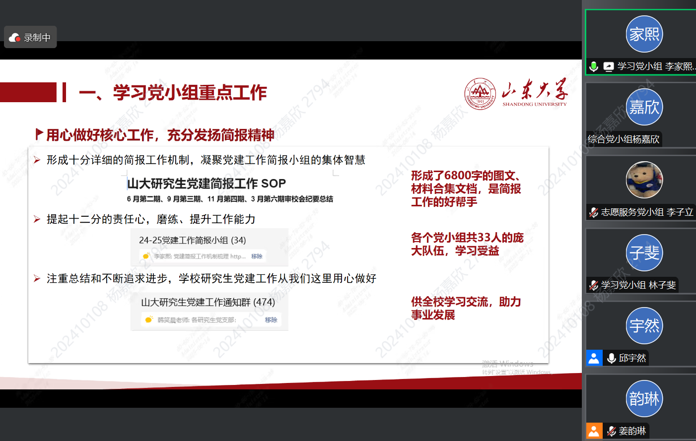 分管学习党小组的副书记李家熙从工作重点、管理经验和未来工作规划三部分进行分享。详细介绍了部门在党建工作简报、研究生“21天读书打卡”活动等工作的开展情况;分享了通过加强培训、合理分工等方式培养骨干的经验;还交流了党建工作简报编发、党支部培育建设等团队建设经验,为后续工作开展提供思路。
