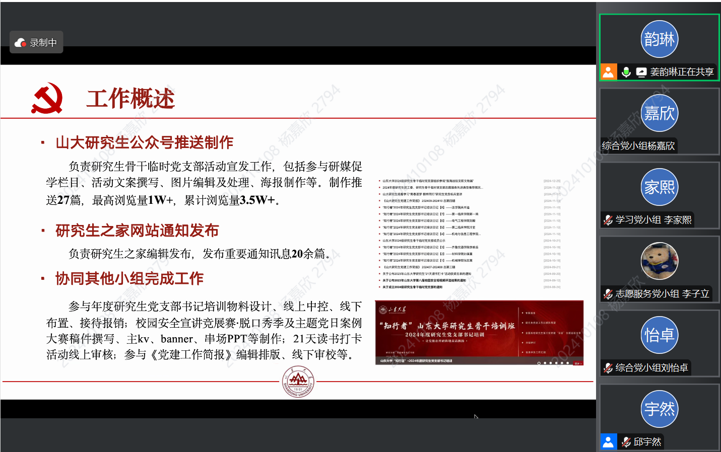 分管宣传党小组的副书记姜韵琳从工作成果、实践经验和未来规划三方面进行分享,详细介绍了宣传党小组在公众号推送制作、网站通知发布等工作中取得的成绩,分享了在年度培训等多项活动中高效协作的经验,提出将着力提升协同率、细节准确度作为下步工作抓手,希望党支部宣发工作迈向新高度。