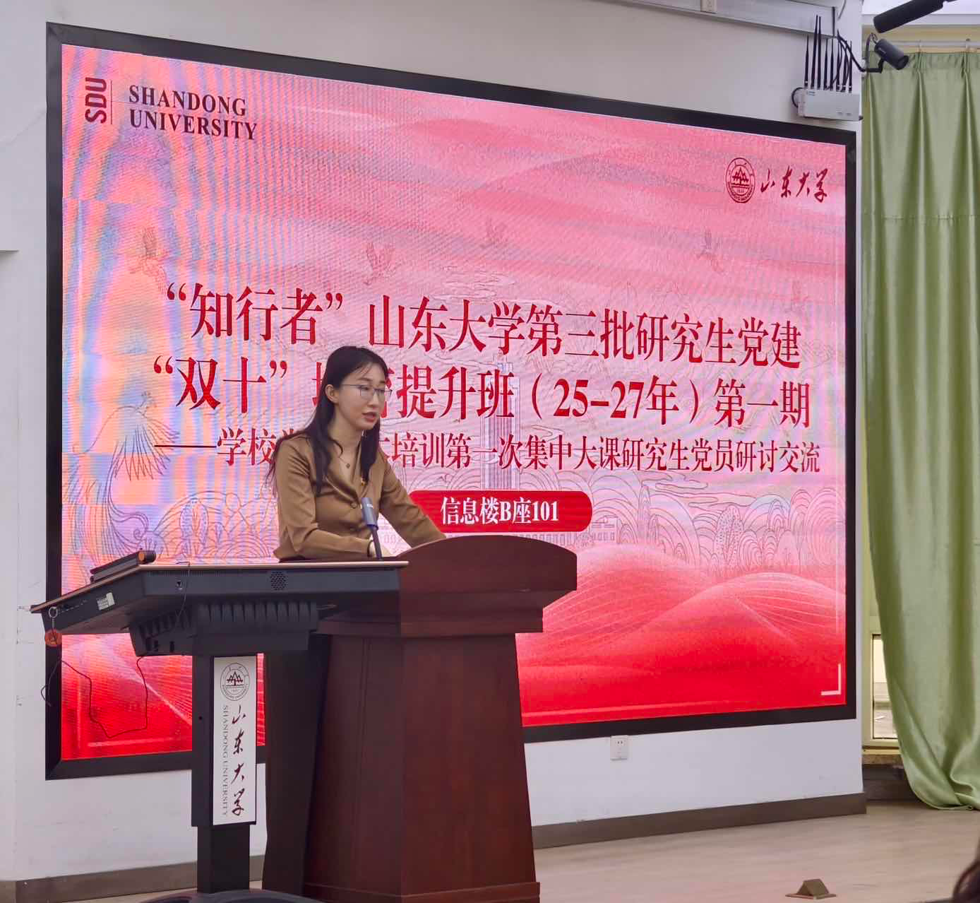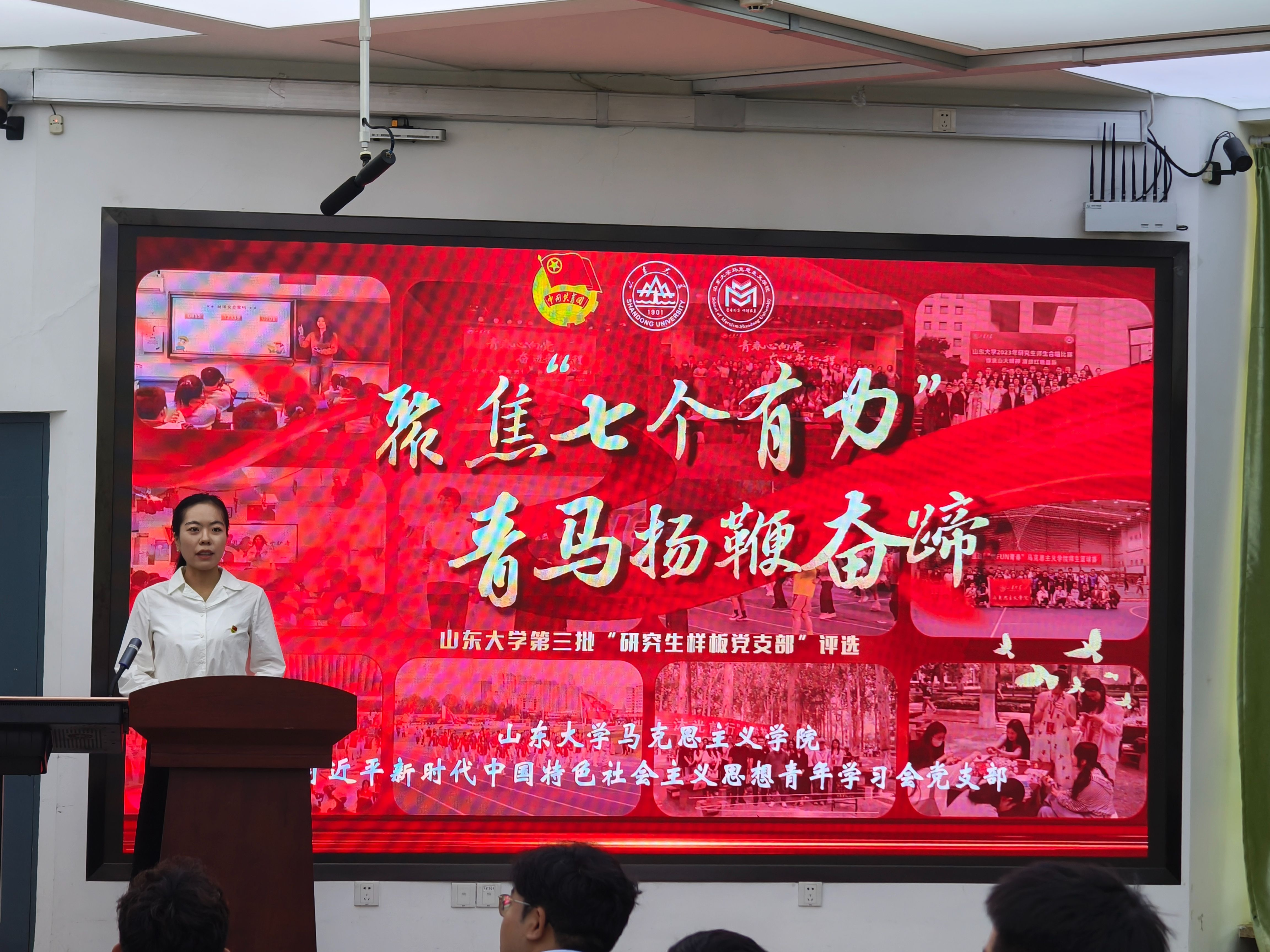 “十个研究生样板党支部”书记依次上台发言,围绕谢春涛校长专题辅导报告精神,结合所在学科特色和支部工作实际与大家进行分享交流,重点介绍了各自支部拳头工作,展现样板党支部品牌建设成果。马克思主义学院习近平新时代中国特色社会主义思想青年学习会党支部书记周顺洁表示,谢春涛校长的授课深刻揭示了中国共产党与中华民族伟大复兴的内在联系,作为马克思主义专业的研究生,我们要自觉用党的创新理论武装头脑,在学术研究中践行初心使命。软件学院人机交互与虚拟现实研究生党支部副书记汪冰倩谈到,科技自立自强是民族复兴的战略支撑,作为信息领域研究生,将聚焦“卡脖子”技术攻坚,把论文写在祖国大地上。各样板党支部书记均表示,在未来的研究生党建工作中将充分吸收本次党员大课的主题精神,夯实党建工作成果,注重党建品牌建设,助推山大研究生党建工作。