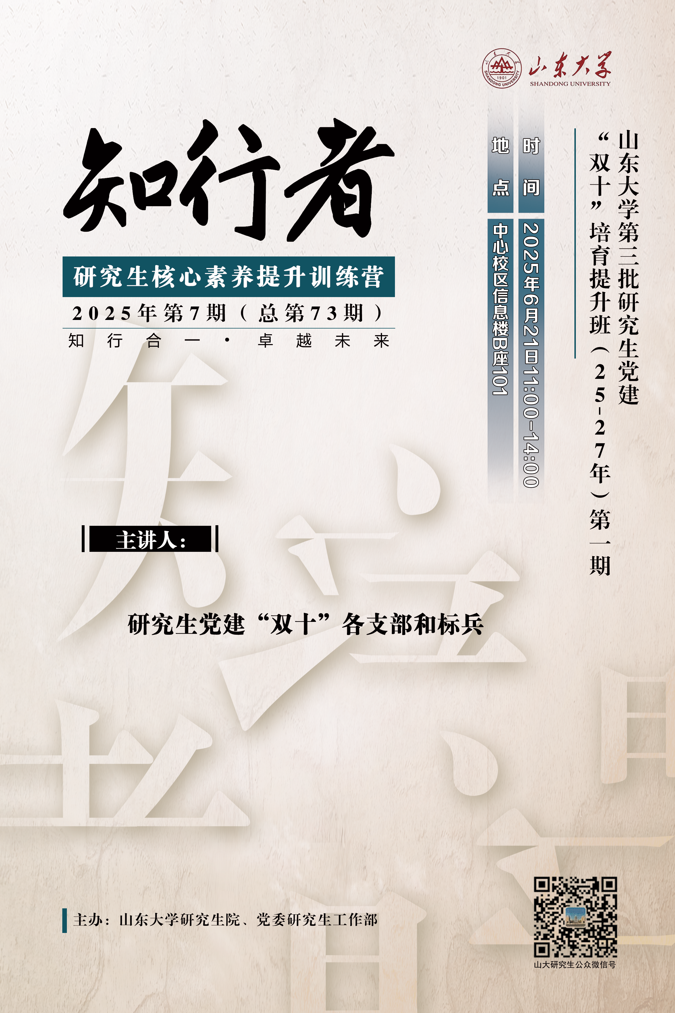 为进一步夯实学校党员基本培训第一次集中大课学习成效,切实提升研究生党员骨干的政治素养和履职能力,研究生院、党委研究生工作部组织学校第三批“十个研究生样板党支部”和“十名党员标兵”在课后开展深入交流研讨,系统总结前期培育成果,全面部署下一步党建“双十”创建期各项工作。来自济南、威海、青岛三校区的硕、博研究生党员60余人参与。