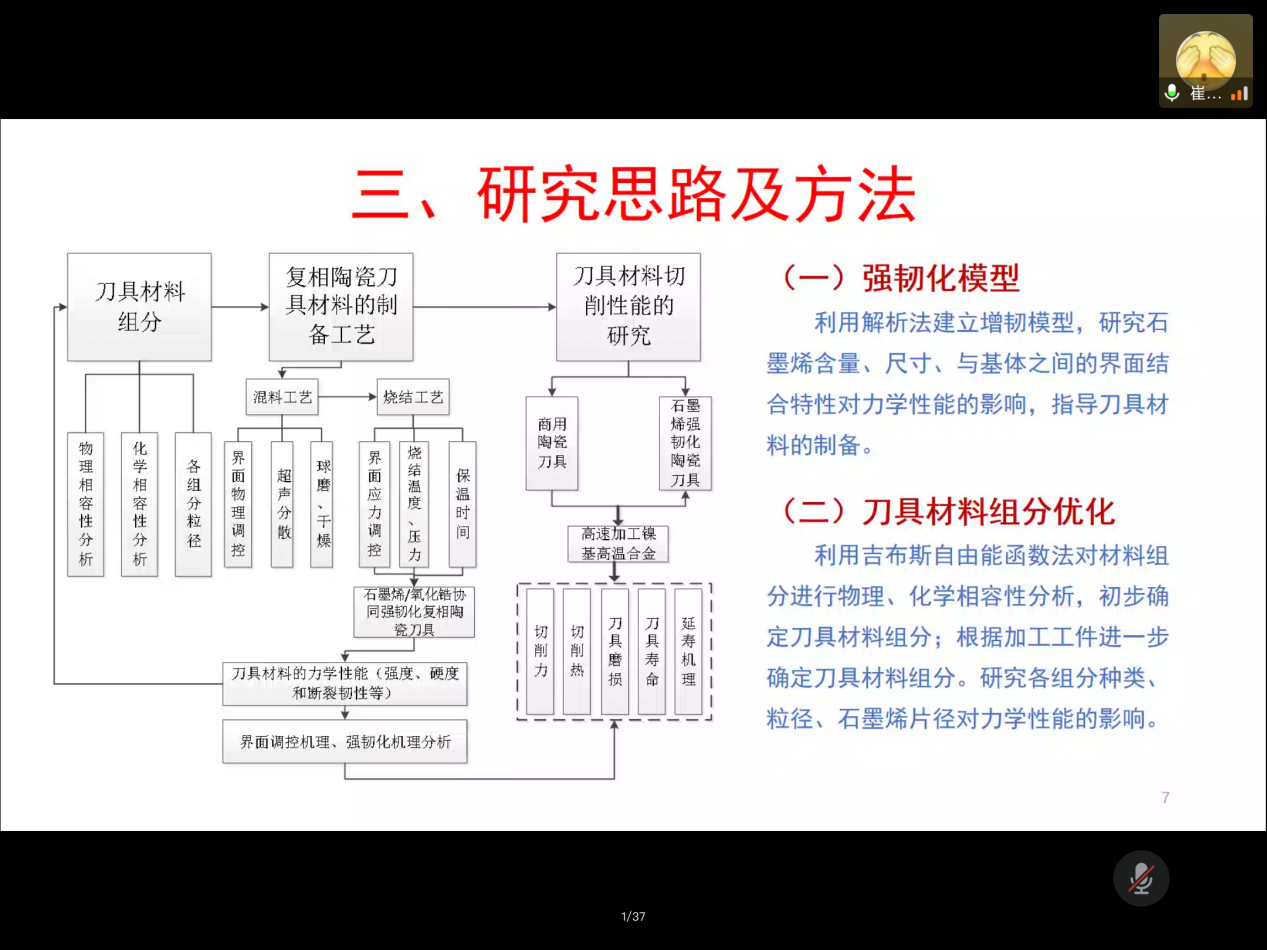 接下来,他从强韧化模型、刀具材料组分优化、制备工艺及强韧化处理以及切削性能研究四个方面对课题研究思路及方法进行了介绍,着重介绍了选用石墨烯/陶瓷刀具进行高速切削实验,与商业化陶瓷刀具进行比对,在刀具磨损、破损形态、刀具寿命、加工表面质量等方面进行综合对比和分析。