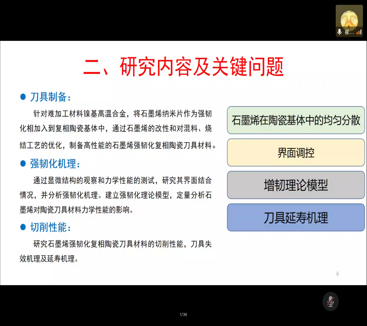 讲座开始,崔恩照首先说明了课题研究背景及意义,并对陶瓷刀具的特点与前景以及石墨烯材料特质进行了介绍。他指出,课题研究的目的是为满足高速切削镍基高温合金的要求,制备一种基于界面调控的石墨烯强韧化陶瓷刀具材料。随后,他从刀具制备、强韧化机理和切削性能三方面对课题研究内容及关键问题进行了详细的介绍。