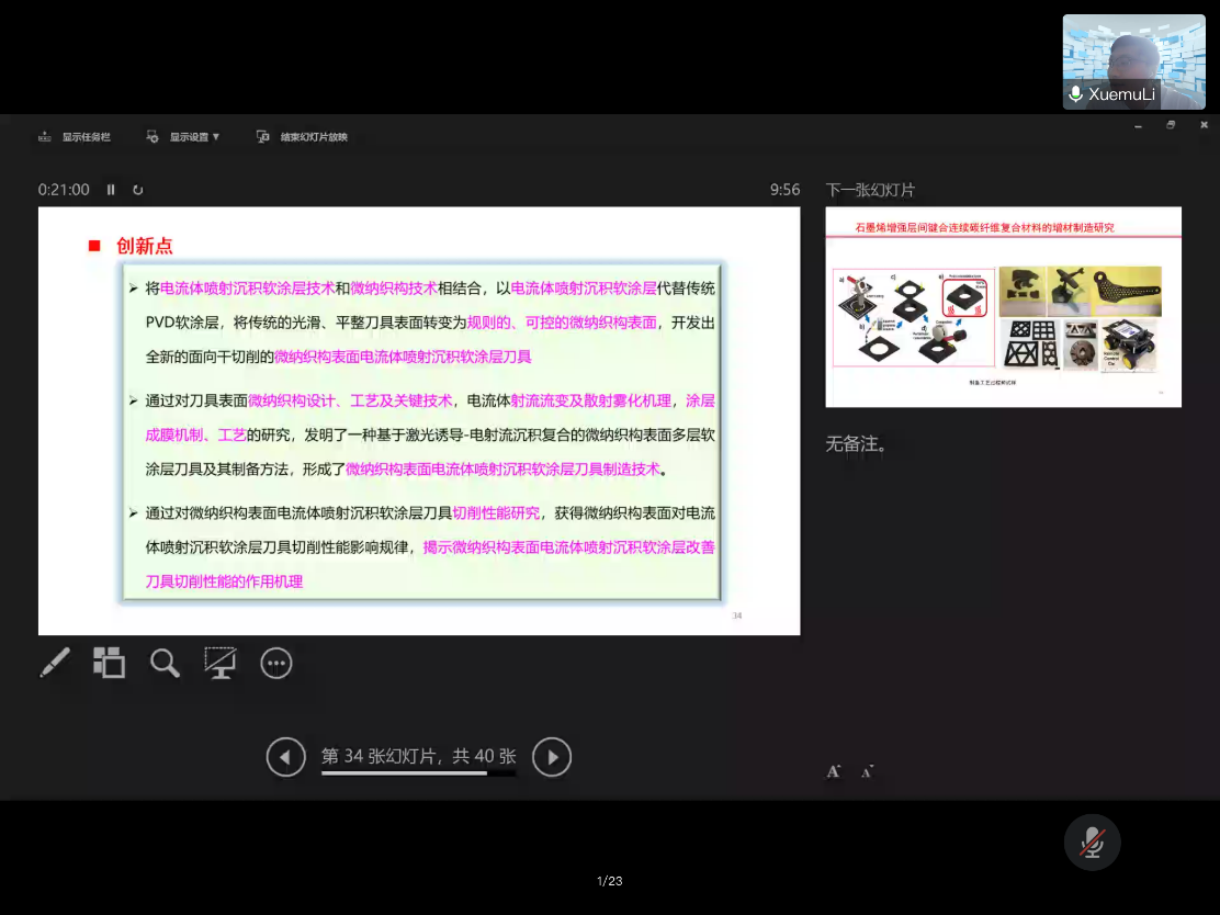 讲座最后,李学木博士对本次研究的创新点进行了总结,本研究开发出了全新的面向干切削的微纳织构表面电流体喷射沉积软涂层刀具,形成了微纳织构表面电流体喷射沉积软涂层刀具制造技术,揭示了微纳织构表面电流体喷射沉积软涂层改善刀具切削性能的作用机理。本次讲座丰富了同学们的知识面,让同学们对微纳织构表面电流体喷射沉积软涂层刀具有了进一步的了解,对今后科研生活坚定了信心。