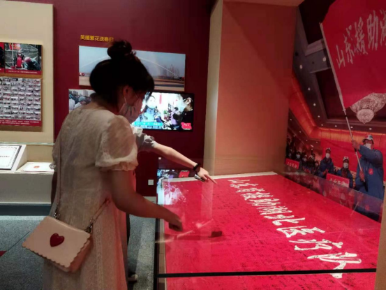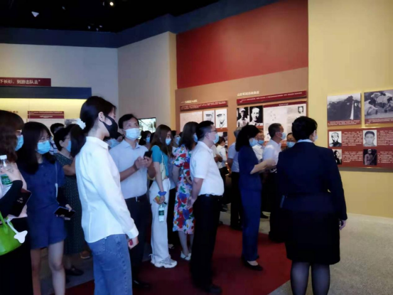 每一张照片都凝固了一个历史瞬间,每一件展品都述说着一段艰辛奋斗,党员同志们在展览中开始了这段见证山东人民在党中央的坚强领导下披荆斩棘、勇往直前的时光之旅。进入山东博物馆大厅,首先映入眼帘的是鲜红的党旗和中国共产党成立100周年庆祝活动标牌,大厅的氛围隆重而喜庆。随后进入展厅,跟着讲解员的脚步沿着时间轴,大家静静瞻仰这一幕幕珍贵的红色记忆。