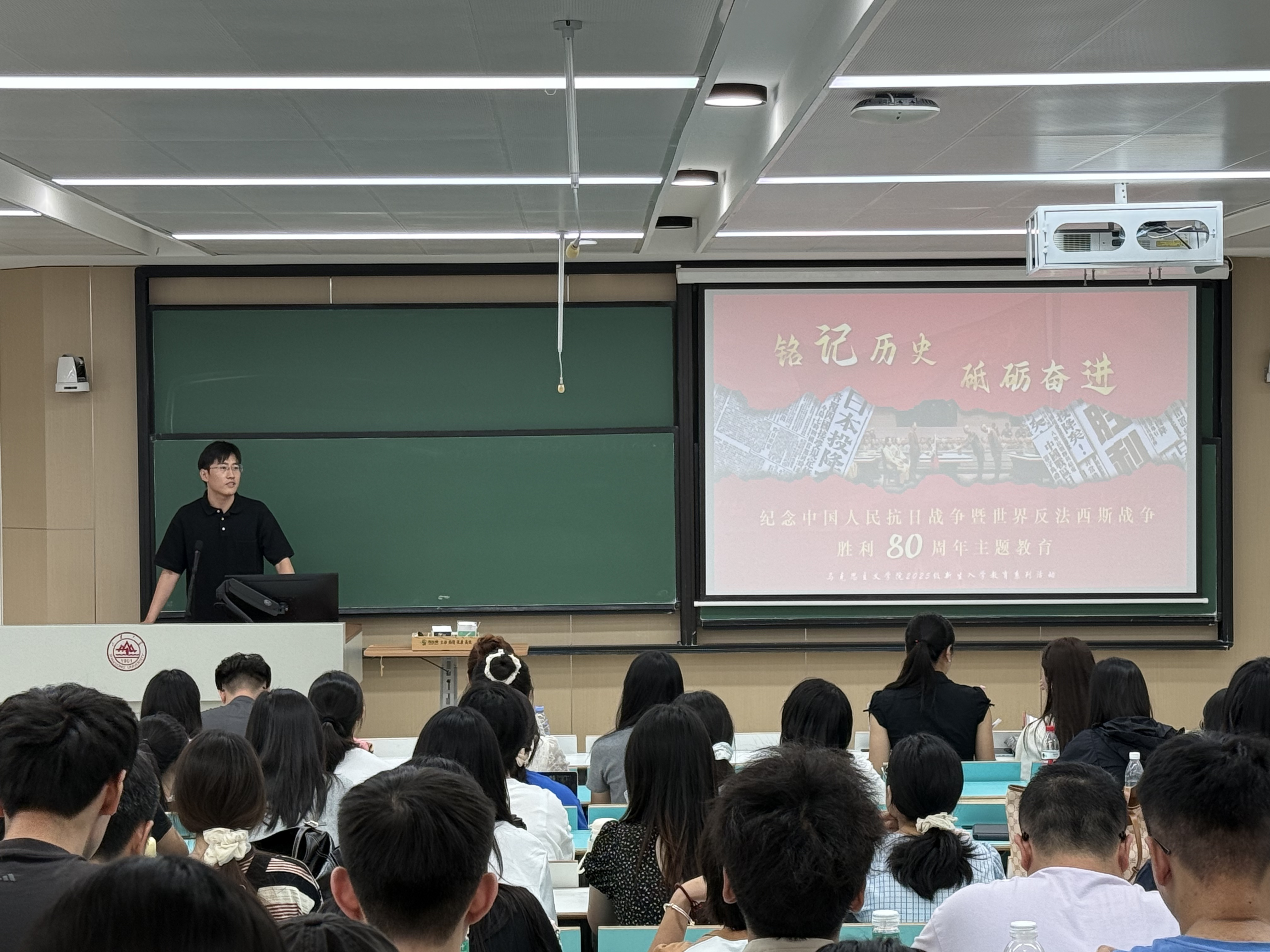 体悟抗战精神,汲取奋进力量。9月3日上午,学院组织2025级全体新生集中观看纪念中国人民抗日战争暨世界反法西斯战争胜利80周年大会,在观看直播后立即组织开展“铭记历史·砥砺奋进”专题教育活动。习近平新时代中国特色社会主义思想青年学习会宣讲团、学院“抗联薪火·东北寻踪”实践团成员围绕学习习近平总书记发表的重要讲话精神,就相关抗战故事展开理论宣讲,解析了伟大抗战精神的当代价值。在场学生深受教育和启发,并结合自身实际和学习感悟积极交流发言。