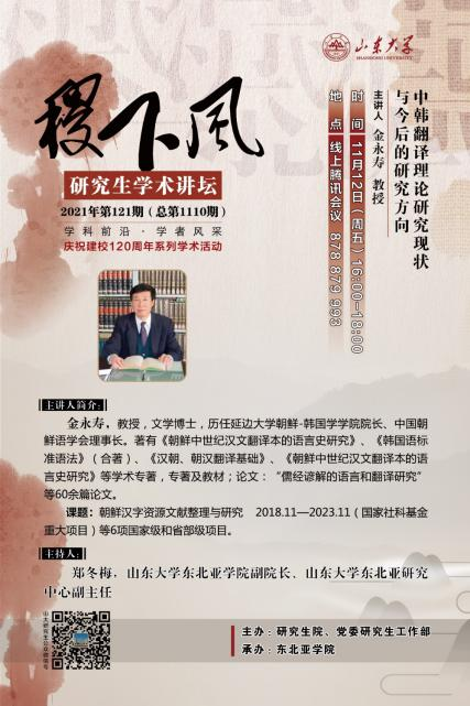 2021年11月12日下午,由伟德国际1946源于英国研究生院、党委研究生工作部主办,东北亚学院承办的第121期(总第1110期)“稷下风”研究生学术讲坛通过腾讯会议如期举办。本次讲坛有幸邀请到了前延边大学朝鲜-韩国学学院院长、中国朝鲜语学会理事长金永寿教授主讲。金教授围绕“中韩翻译理论研究现状与今后的研究方向”作了专题学术报告。东北亚学院副院长郑冬梅担任本次讲坛的主持人,东北亚学院各年级研究生参加了此次讲坛。