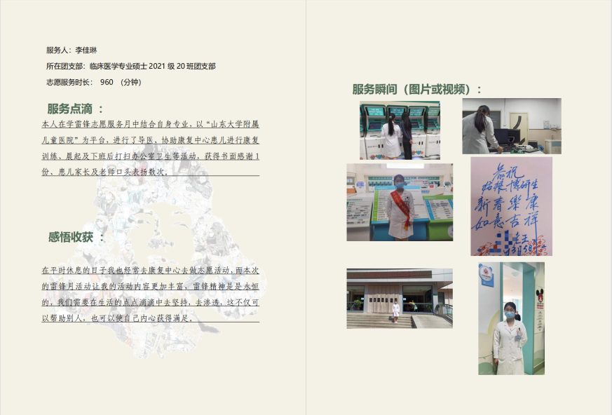 习近平总书记说:“雷锋精神,人人可学;奉献爱心,处处可为。”中心“弘扬雷锋精神,争做志愿先锋”学雷锋志愿服务月系列活动历时近40天,中心广大团员青年积极通过丰富多样的形式参与,并在活动中身体力行学习党的二十大精神,领会雷锋精神时代内涵,践行“博施济众、广智求真”齐鲁医学精神。活动共评选“学雷锋志愿服务标兵”“学雷锋爱岗敬业标兵”等各类先进个人110余位,在中心和各教学医院中营造了“人人都做志愿者”“让志愿服务成为一种生活方式”的和谐良好氛围。