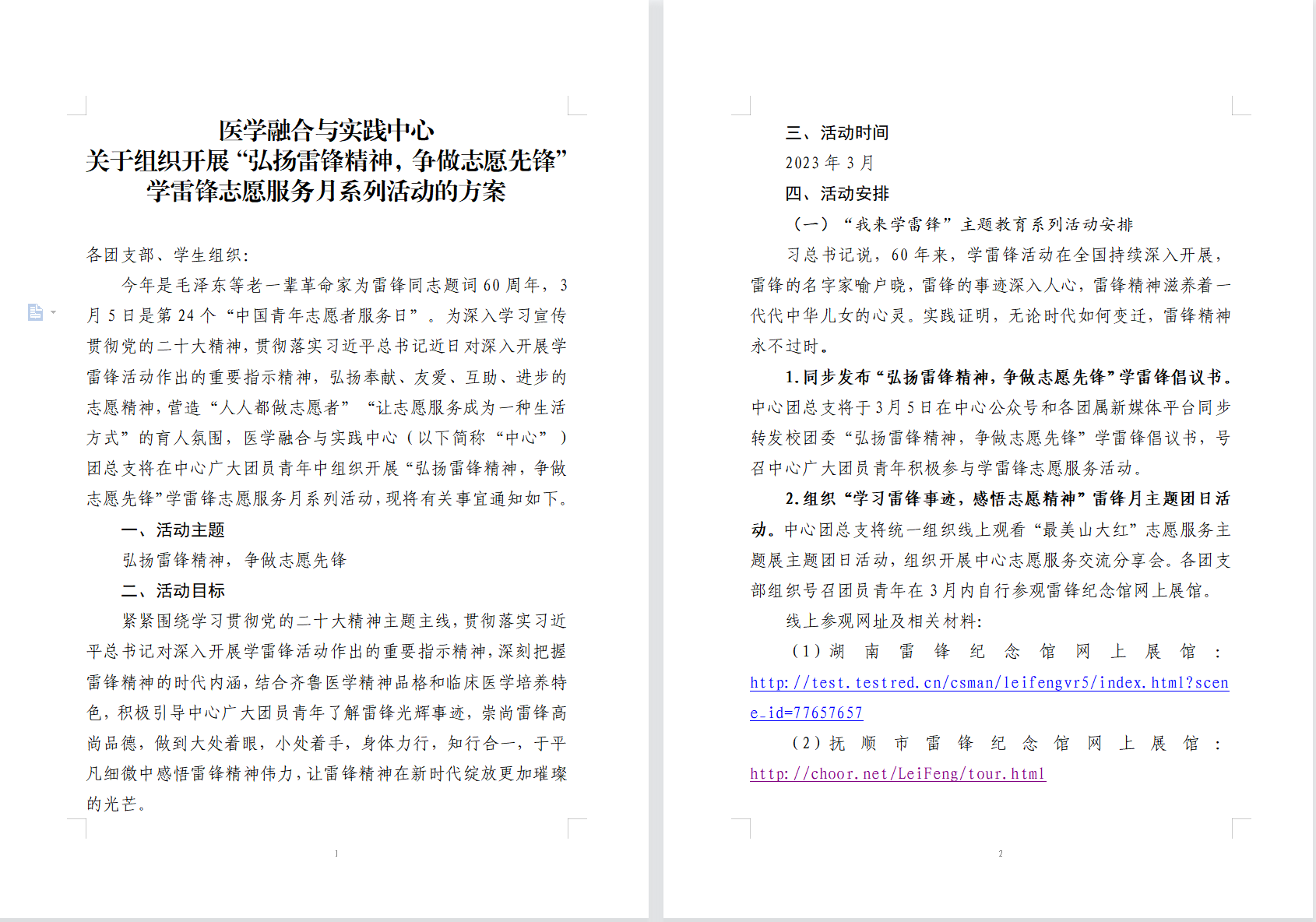 今年是毛泽东等老一辈革命家为雷锋同志题词60周年,为深入学习宣传贯彻党的二十大精神,全面落实习近平总书记关于深入开展学雷锋活动的重要指示,以实际行动发扬“奉献、友爱、互助、进步”的志愿服务精神,医学融合与实践中心组织开展“弘扬雷锋精神,争做志愿先锋”学雷锋志愿服务月系列活动,引导中心广大团员青年深刻把握雷锋精神的时代内涵,践行“博施济众、广智求真”的齐鲁医学精神,营造“人人都做志愿者”“让志愿服务成为一种生活方式”的和谐育人氛围。