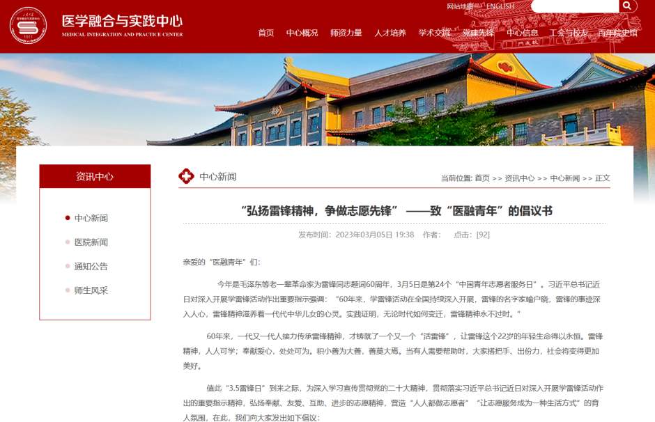 紧紧围绕学习贯彻党的二十大精神主题主线,结合齐鲁医学精神品格和临床医学培养特色,构建“党总支引领、团总支赋能、团支部执行”三级工作推进模式,制定《“弘扬雷锋精神,争做志愿先锋”学雷锋志愿服务月系列活动方案》,发布《“弘扬雷锋精神,争做志愿先锋” —致“医融青年”的倡议书》,积极引导中心广大团员青年了解雷锋光辉事迹,崇尚雷锋高尚品德,做到大处着眼、小处着手、身体力行、知行合一,于平凡细微中感悟雷锋精神伟力,让雷锋精神在新时代绽放更加璀璨的光芒。
