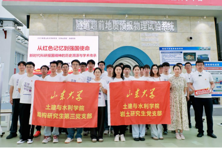 为深入学习贯彻习近平新时代中国特色社会主义思想,纪念中国人民抗日战争暨世界反法西斯战争胜利 80 周年,7 月 22 日,土建与水利学院岩土研究生党支部与结构研究生第三党支部依托隧道工程灾变防控与智能建养全国重点实验室,联合举办“从红色记忆到强国使命:新时代科研报国精神的历史溯源与学术传承”红色云游览主题党日活动。活动同步在“山大研究生”视频号直播,线上观看与互动超过 300 人次。